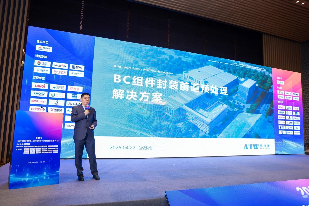 4月22日,2025年度光伏高效電池、組件封裝與可靠性技術大會在蘇州召開。作為光伏領域極具影響力的技術交流平臺,此次論壇聚焦各類高效太陽電池、組件的封裝及各類新型封裝材料的最新技術等專題,吸引了眾多業界精英參與。奧特維受邀參加本次論壇并就《BC組件封裝前道預處理解決方案》進行專題演講。