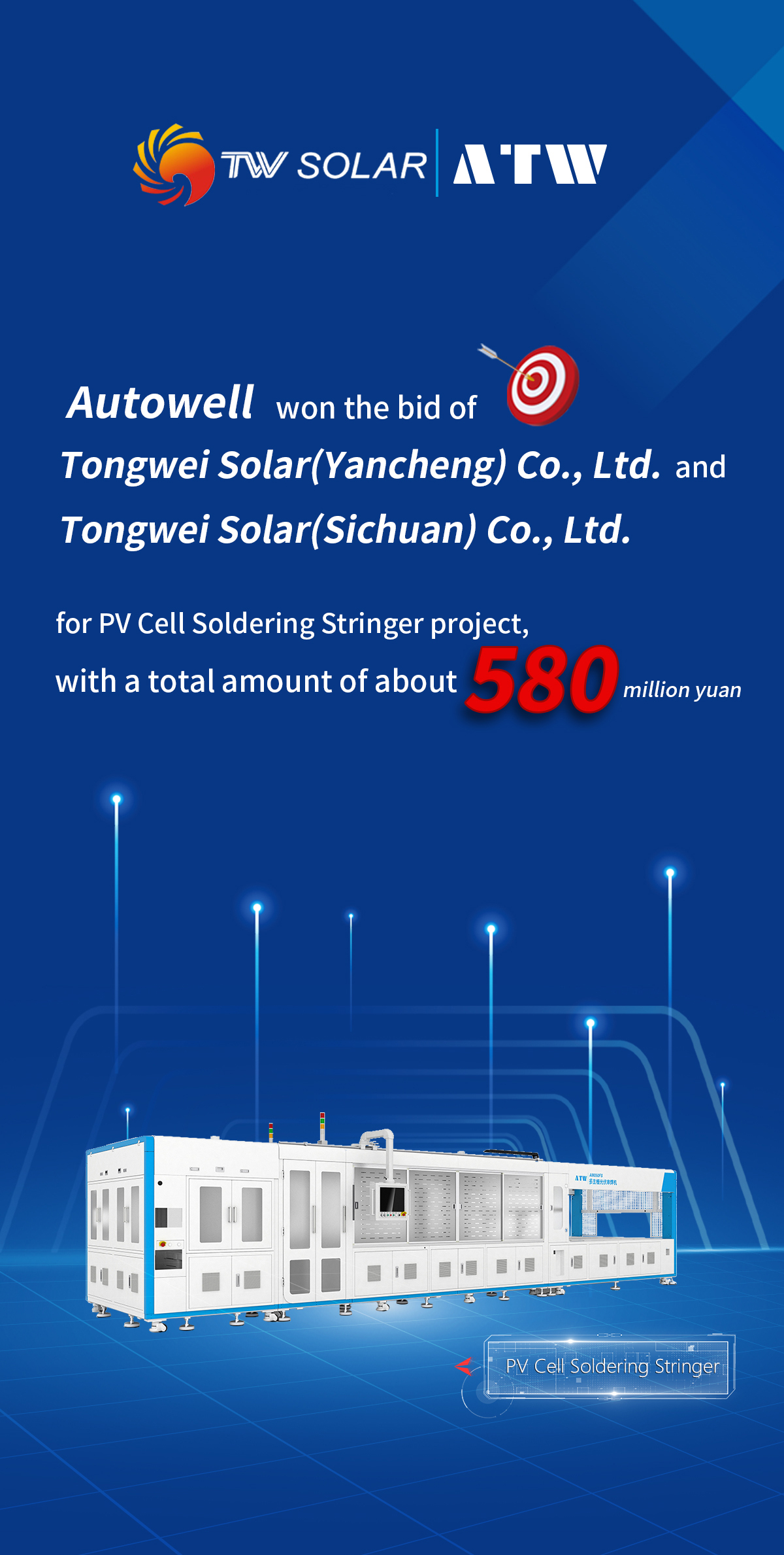 奧特維中標通威太陽能(鹽城)有限公司、通威太陽能(四川)有限公司劃焊一體機項目,中標金額約5.8億元。