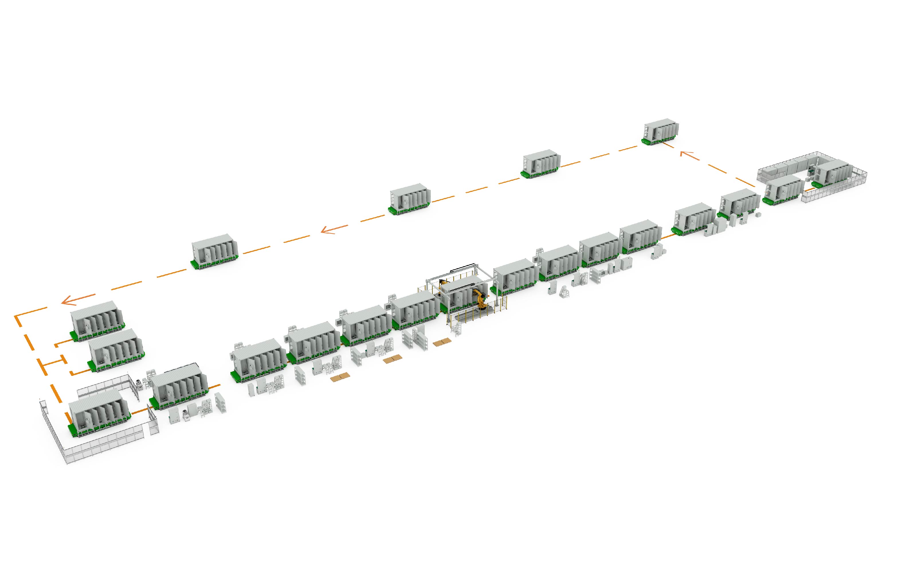 The assembly solution for container type energy storage system integrates the assembly line, the heavy load handling system and the warehousing system, and the process flow of assembly line includes container loading/unloading, material preassembly, power cable and electrical system assembly, loading PACK to rack & pre-tightening, PACK tightening, wire harness connection, Hipot test & labeling, weak current system debugging and PCS test.