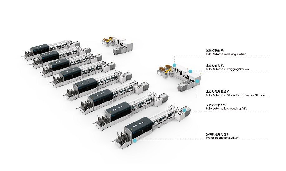 是一款集成分選下料對接、硅片搬運、整線匯流、復檢套袋、分類裝箱、碼垛打托等部分組成的硅片下料全自動整線方案。